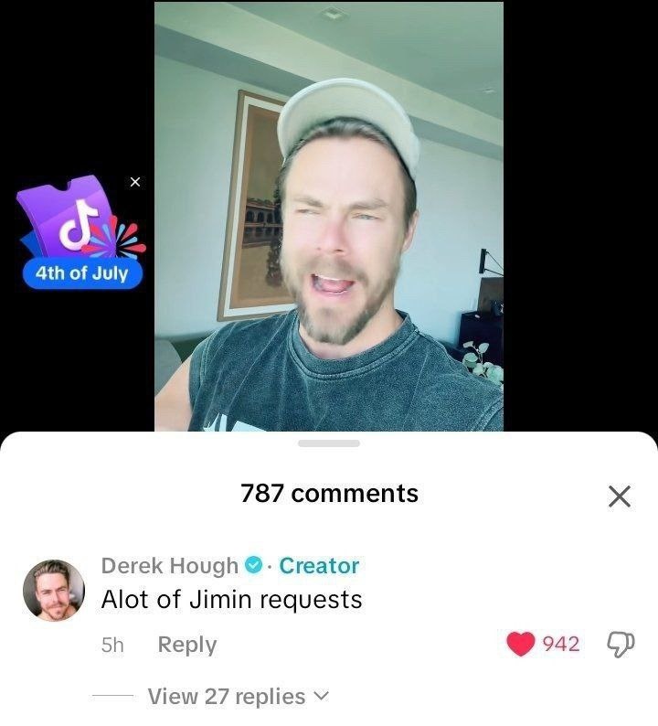 🐾 Дерек Хаф, американский танцор и хореограф, известный своим участием в шоу ABC "Танцы со звёздами", упомянул Чимина, отвечая на вопрос о