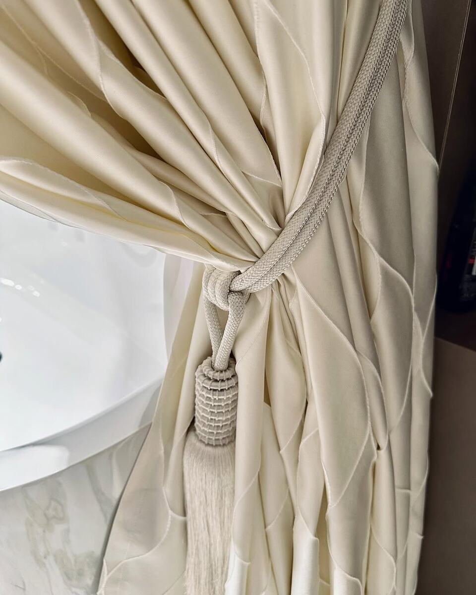 Ванная комната — это не просто про плитку и сантехнику. Это про ощущение. Про тактильность. Про момент, когда вы закрываете за собой дверь и остаетесь наедине с собой✨⠀ Именно здесь начинается день — и заканчивается он тоже здесь. Утренний свет, горячая вода, тишина. Всё должно работать на вас. А в создании настроения ключевую роль играет текстиль. Мы собрали 8 вдохновляющих примеров, в которых текстиль стал не просто функциональным элементом, а выразительным акцентом, подчёркивающим эстетику, усиливающим настроение и визуально связывающим интерьер в единое целое. 1. Смелый авангард Пеликан на стене, шахматная плитка и винтажная мебель — интерьер сам по себе сильный и вызывающий. Мы добавили ему финальный штрих: двойную штору на изогнутом карнизе. Водонепроницаемое полотно выполняет свою задачу, а декоративная драпировка собирает цветовую гамму и поддерживает орнаментику. Эстетика + эффект — на 100%. 2. Классика с характером Портьера цвета топлёного молока с ручной вышивкой, драпировк