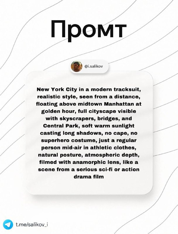 Представьте Нью-Йорк в образе современного человека. Не супергерой, не магический персонаж, а обычный парень в стильных трениках. Представьте, как он парит над Манхэттеном на закате: мягкий золотой свет ложится на небоскрёбы, Центральный парк, мосты… Всё вокруг будто сошло с кадра серьёзного научно-фантастического фильма. Атлетичный, в естественной позе, без пафоса и лишних деталей — просто он и атмосфера большого города. "New York City in a modern tracksuit, realistic style, seen from a distance, floating above midtown Manhattan at golden hour, full cityscape visible with skyscrapers, bridges, and Central Park, soft warm sunlight casting long shadows, no cape, no superhero costume, just a regular person mid-air in athletic clothes, natural posture, atmospheric depth, filmed with anamorphic lens, like a scene from a serious sci-fi or action drama film." ✨ Как вам такая визуализация? #Midjourney #AIискусство #нейросети #городмечты #визуализация https://tsss.me/eMvPZ7JV