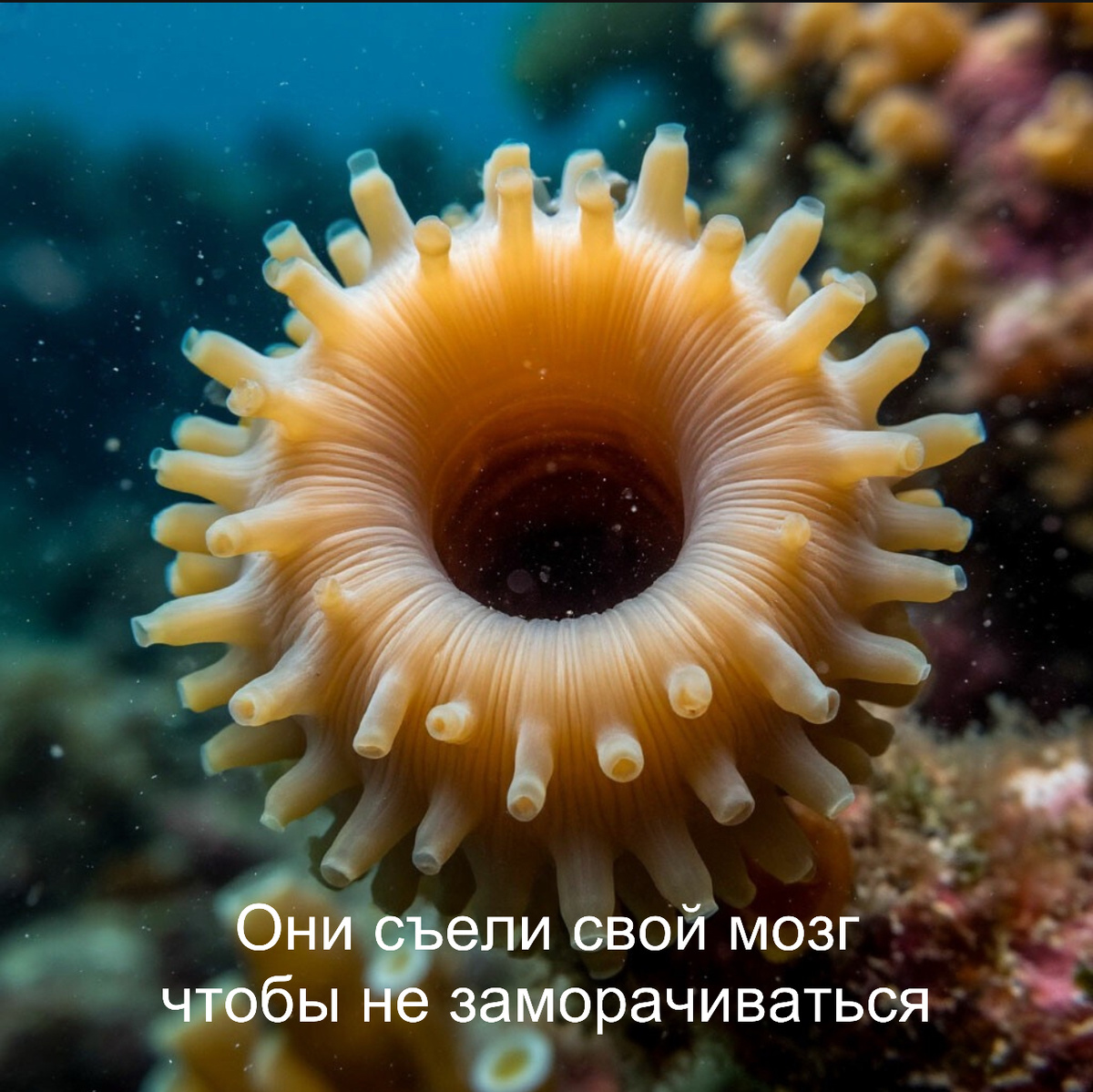 Есть такие животные АСЦИДИИ хордовые, как и люди, и были бы счастливы, НО у них мозг есть, как и у людей, ну почти. И, пока молоды и активны, они им пользуются. Много думают, переживают о будущем, как и люди.. И активно ищут лучшее место для жизни, где можно закрепиться. Камень или скалу. Находят. Закрепляются и.. съедают свой мозг.. А зачем он им когда место тёплое, еда и так попадает в рот. Даже если место не вполне хорошее, мозг их так тяготит, вот все эти поиски лучшего места, лучшей жизни, хорошей пары, они всё равно закрепляются и первым делом …съедают свой мозг. Ведь очень уж он много энергии потребляет, как и у людей. Так у человека, не очень-то большой, по сути, мозг, килограмма на 2-3, в покое забирает 30% энергии.. всё думает о чём-то, и даже во сне процентов 10 берёт. А смысл?! Плюс он заставляет искать самую красивую пару для спаривания. Вот поэтому, Асцидия, понимая всё это, первым делом переваривает свой мозг и даже обучается партеногенезу - создавать свою копию бе