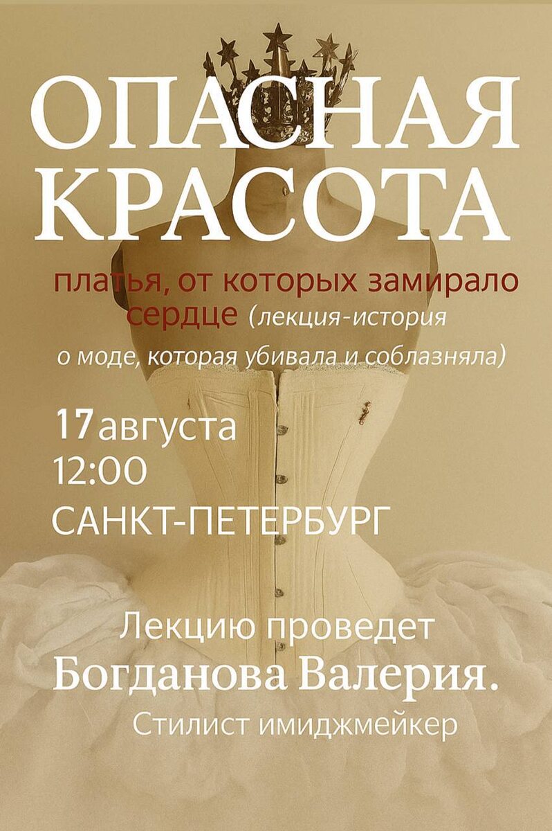 ❗️ПРЕМЬЕРА❗️ ОПАСНАЯ КРАСОТА: платья, от которых замирало сердце (буквально) Лекция-история о моде, которая убивала и соблазняла Дата: 17 августа | 12:00 (вс) Адрес: центр,место уточняется МЕСТ: 12 Лектор — Валерия Богданова Практикующий стилист имиджмейкер с 10-летним опытом, автор курсов. Создала более 1000 гардеробов для женщин, раскрыва их стиль как способ самовыражения и источник уверенности. Корсеты, в которых задыхались. Кринолины, из-за которых женщины сгорали заживо. Ядовитые ткани, от которых умирали. И… веера, которые говорили больше, чем слова. Ты узнаешь: • Какие платья XIX века действительно калечили женщин (и почему они всё равно их носили) • Как мышьяк, металл и огонь стали частью женского гардероба • Как с помощью веера можно было сказать «ты мне нравишься»… или «вы мне противны» • Почему одежда была не только про моду, но и про власть, страсть и игру Живое, визуальное и очень неожиданное погружение в историю моды. Приходи — будет красиво, страшно и захватывающ