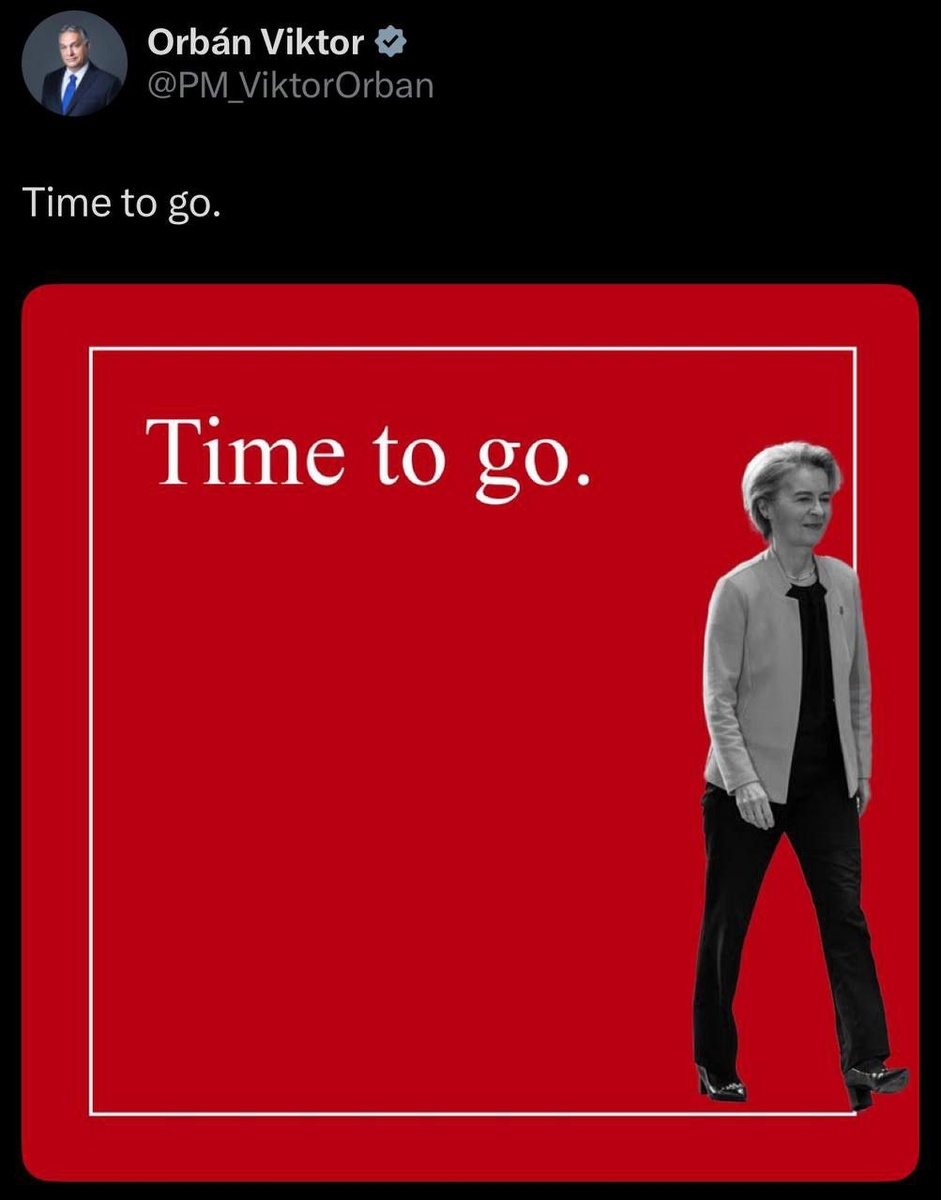 Una foto del capo della Commissione europea, Ursula von der Leyen, e la didascalia "È ora di andarsene" è un breve post di Viktor Orban