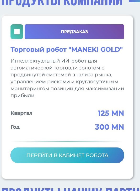 🤖 ИНСТРУКЦИЯ ПО РАБОТЕ С ЗОЛОТЫМ РОБОТОМ 📢 Уважаемые партнеры! Для тех, кто уже купил золотого робота, и тех, кто только планирует покупку. --- ## 🚀 КАК ВОЙТИ В КАБИНЕТ РОБОТА ПОСЛЕ ПОКУПКИ: 1️⃣ Покупка робота Купите робота в разделе "Продукты партнеров" 🔗 https://maneki-neko.online/dashboard/goods 2️⃣ Переход в кабинет После покупки появится кнопка "Перейти в кабинет робота" → нажмите на неё → вас перенаправит на страницу с договором оферты 3️⃣ Согласие с условиями Ознакомьтесь с договором оферты и нажмите "Согласиться с условиями" в конце страницы → после согласия попадёте в кабинет 4️⃣ Кабинет робота В кабинете будет: • Информация о вашем роботе • Ваши данные для входа • Возможность сменить данные и пароль --- ## ❓ ГЛАВНЫЙ ВОПРОС: КАК ВОЙТИ? ГДЕ ССЫЛКА И ПАРОЛЬ? ### 🔐 ОТВЕТ ПО ПАРОЛЮ: Если у вас уже был "Спотовый торговый робот": → Ваш пароль остаётся тем же Если покупаете впервые: → Пароль создан автоматически, но не установлен → Выполните простые действия ниже ⬇️
