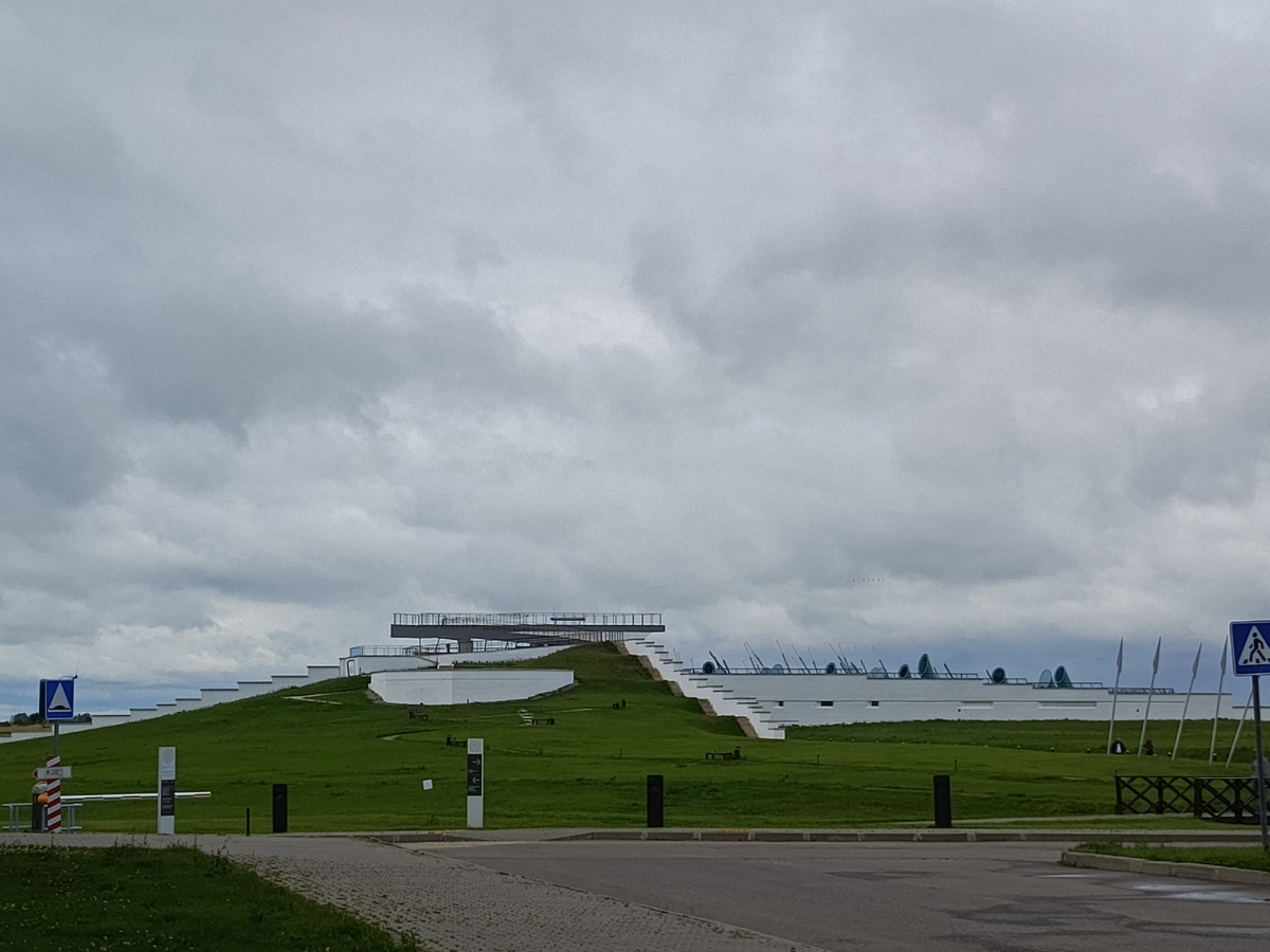 Следующая наша остановка после Красного Холма- село Моховое, где в 2016 году был открыт новый, современный музей, построенный буквально в "чистом поле"- непосредственно рядом с предполагаемым местом сражения. Выезжая с Красного Холма проезжаем кольцо, в центре которого установлен памятник "Благословление князя Дмитрия Донского преподобным Сергием Радонежским", установленный в 2014 году На повороте к музею вот такая стела, мимо не проедете На стоянке- машин мало. Рядом- музейный центр, где можно купить билеты (дети до 16 лет на основную экспозицию бесплатно!), сувениры. Здесь же кафе. И стенд с подробной схемой Бывают сборные экскурсии по часам, но мы по времени не попадали, поэтому приобрели билеты (дети до 16 лет на основную экспозицию бесплатно!) и пошли к музею по главной аллее для самостоятельного осмотра На посещение музея закладывайте 3 часа- не меньше! Здесь очень много интерактива- сенсорные экраны, на которых можно почитать историческую информацию, поучаствовать в викторине, п