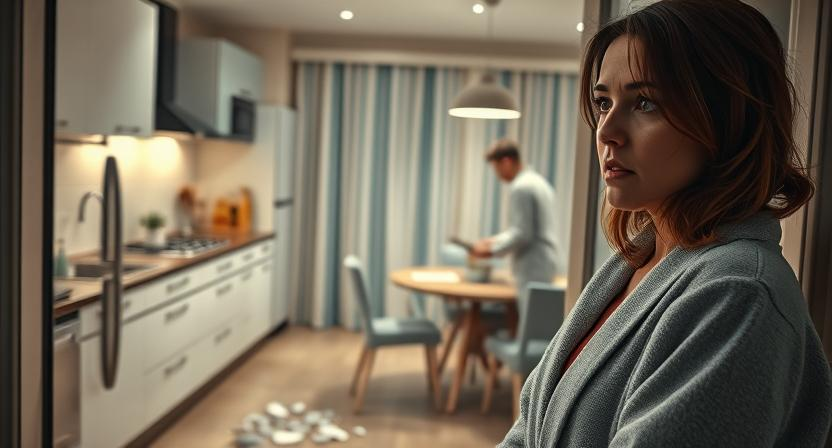 Ольга подкралась ближе и замерла в дверном проёме. На кухне горел свет. Сергей и его мать, Галина Петровна, стояли у открытого шкафчика с посудой. На полу валялись осколки разбитой тарелки.