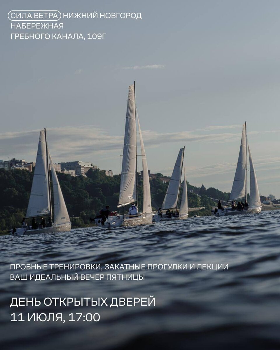 ⛵️ День открытых дверей в Силе ветра Отличная возможность попробовать яхтинг, если давно откладывали или сомневались. 🌊 Пробные тренировки для всех желающих, прогулки на закате со скидкой, лекторий и игры в пинг-понг в самый разгар лета в Нижнем. 11 июля, 17:00-21:00 👉 Подробное расписание и ссылки на регистрации — здесь.