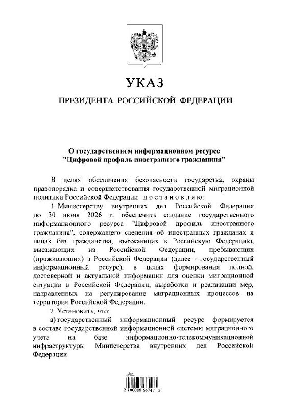 ⏺Путин подписал указ о создании до 30 июня 2026 года информационного ресурса «Цифровой профиль иностранного гражданина».