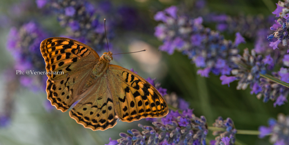 Сейчас в саду пышно цветёт лаванда – её фиолетовые цветы не только радуют глаз, но и привлекают множество бабочек. Например, вот эта красавица – перламутровка – прилетает только по утрам, чтобы полакомиться сладким нектаром.