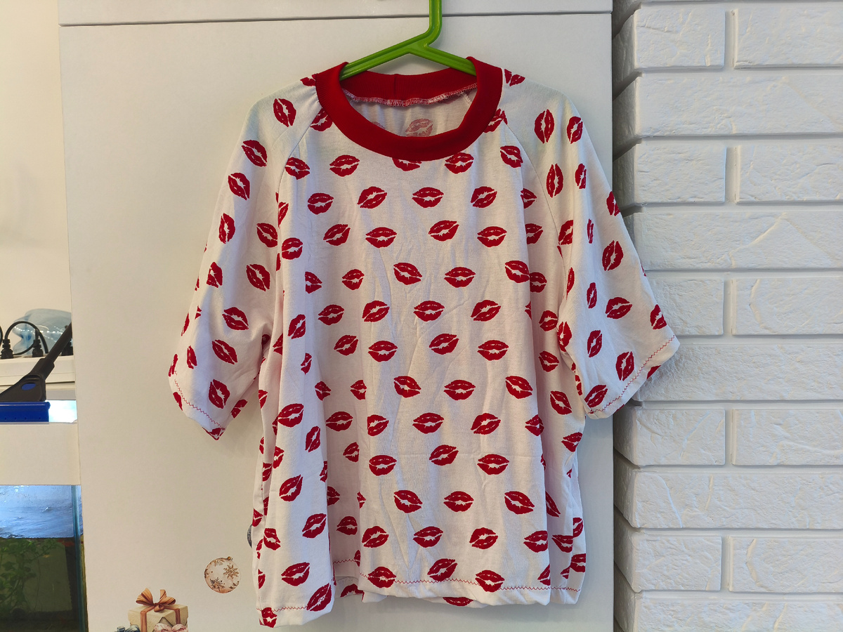 Шить буду футболки. Из хлопковой кулирки. Принты классные, но качество полотна Карде, поэтому изделия точно будут недолговечные, но, безусловно, любимые. Кроме того, в составе нет лайкры, поэтому модель довольно свободная выбрана. Выкройка: Тимми от Lekamarket Огромное количество футболок и пуловеров уже сшито по ней. Она прекрасна! Не оверсайз, просто свободная футболка. За счёт реглана смотришься не широкоплечей дамой, а довольно миленькой и женственной 😅 Первая футболка из кулирки с поцелуйчиками. Насколько же давно было куплено это полотно!!!! Девочки, 220 рублей! (Я оставляю записки в тканях с информацией о вто и цене). Считай, даром! Берегла кулирки очень. Не из-за цены, а потому что принт уж больно нравится. Но настало не время! Пока не отшила низ, нужно что-то однотонное, но это не точно 😄 В общем, следите за влогами в ВК, там что-то точно появится) Кроме горловины из красного кашкорсе в футболке что интересного? Подшила как обычно зигзагом, но нитками блестящими - для вышивк