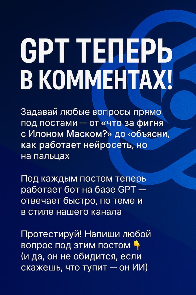 🧠 GPT теперь в комментах! Задавай любые вопросы прямо под постами — от "что за фигня с Илоном Маском?" до "объясни, как работает нейросеть, но на пальцах" ⠀ ✍️ Под каждым постом теперь работает бот на базе GPT — отвечает быстро, по теме и в стиле нашего канала. ⠀ 💬 Протестируй! Напиши любой вопрос под этим постом 👇 (и да, он не обидится, если скажешь, что тупит — он ИИ) #Techtaim #чатgpt #ботвделе