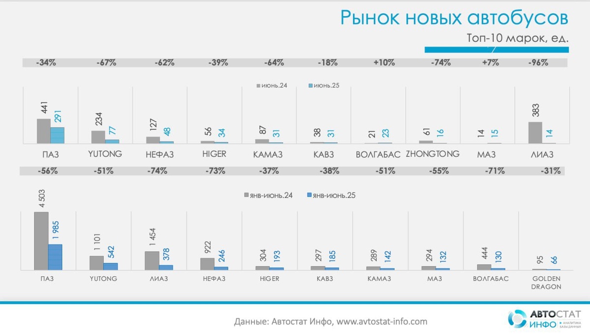 Продажи павловских автобусов снизились на 56%. Несмотря на сокращение спроса ПАЗ остается лидером рынка. Продажи китайского Yutong упали на 51%, ЛиАЗа – на 74%, «НЕФАЗа» - на 73%.