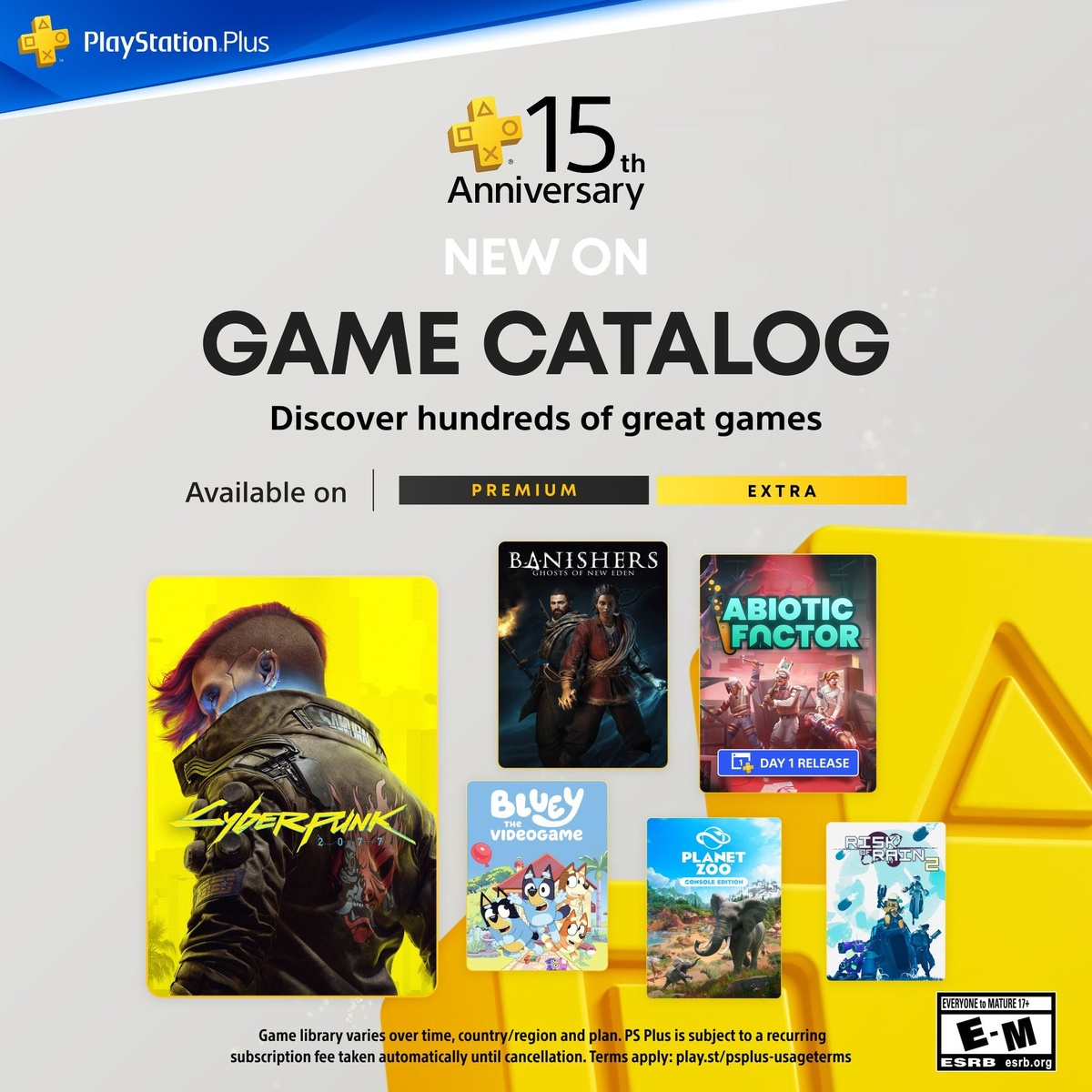 Новинки каталогов PS Plus. Их добавят 15 июля. — PS Plus Extra: • Cyberpunk 2077 (уже доступна) • Abiotic Factor (22 июля) • Banishers: Ghosts of New Eden • Bluey: The Videogame • Planet Zoo • Risk of Rain 2 • Tropico 6 • New World: Aeternum. — PS Plus Premium/Deluxe: • Twisted Metal 3 • Twisted Metal 4