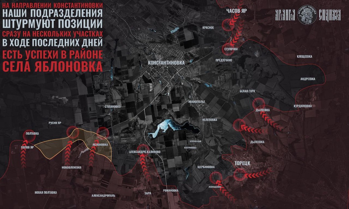 На Константиновском направлении российские штурмовые подразделения развивают наступление сразу на нескольких участках фронта. Особенно активные бои идут на южном направлении — штурмуется линия Полтавка – Яблуновка. За последние сутки отмечено заметное продвижение внутри самой Яблуновки и на её окраинах.
