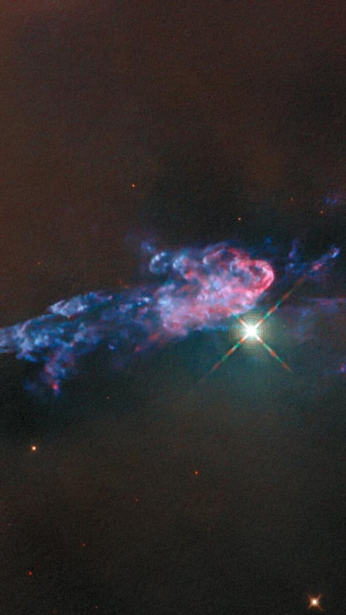 Молодые звёзды в Туманности Ориона: рождение в действии Эти формирующиеся звёзды находятся в глубинах Туманности Ориона — ближайшего к Земле массивного региона звездообразования. Мощные инструменты Hubble позволили запечатлеть, как протозвёзды изменяют своё окружение. Яркое цветное свечение на снимке представляет собой джет (струю), исходящий от протозвезды HOPS 153. Эта мощная струя сталкивается с окружающим газом и пылью Туманности Ориона, создавая ударные волны. Другой светящийся объект — это двойная звёздная система, где две молодые протозвезды обращаются друг вокруг друга. Каждая звезда окружена небольшим пылевым диском, из которого она продолжает аккрецировать (поглощать) вещество, постепенно увеличивая свою массу. Тёмная полоса, пересекающая яркое свечение этих протозвёзд, представляет собой облако газа и пыли, падающее на эту пару.