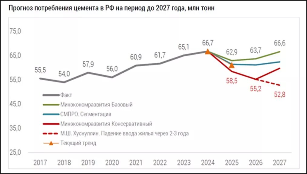 Важно было бы получить государственный прогноз, в котором обозначенные объемы потребления цемента гарантированы государством — отмечает Мартынкина — Дарья Мартынкина, исполнительный директор отраслевого объединения «СОЮЗЦЕМЕНТ», представила обновлённый прогноз потребления цемента в России на ближайшие три года. Ниже — главные цифры 2025 год: – Ожидается снижение до 58,5–62,9 млн тонн (до –12,3% к цифрам 2024), что связано с сокращением жилищного строительства и общей экономической динамикой. – Текущая динамика (январь–май 2025): потребление цемента уже снизилось на 8,5%, что соответствует прогнозу. Базовый/консервативный сценарий потребления цемента на 2026–2027 годы при постепенном восстановлении строительства: – В 2026 — в диапазоне 55,2-63,7 млн тонн (от -5,6 до +1,2% к уровню 2025 года). – В 2027 — в диапазоне 52,8-66,6 млн тонн (от -4,4 до +8,2% к уровню 2026 года). Сценарий потребления «по вице-премьеру Марату Хуснуллину» — при падении ввода жилья на 25% При таком сценарии снижен