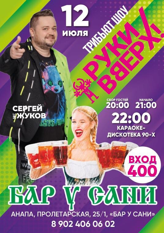 Здравствуйте дорогие гости, а вот и наступил тот момент когда стоит оторваться по полной🤗 🎤Впервые у нас трибьют "Руки вверх" ⏫ Кто помнит как под "18 мне уже" танцевал на выпускном? А плакал под "Алешку"? И так мы вас приглашаем на мега вечер с НеЖуковым, а после караоке-дискотека 90-х🥳 За образ в тематике 90-х каждому бокал пенного 🍺 в подарок 🎁 Во время караоке-дискотеки будет проводится розыгрыш черного ящика (секретный приз от заведения) 🤗 📆Суббота, 12 июля 20-00 Сбор гостей 21-00 Начало крутого вечера 22-00 караоке- дискотека Бронь стола📲 8-902-406-06-02. 📌"БАР У САНИ", Анапа, ул. Пролетарская, 25/1 18+