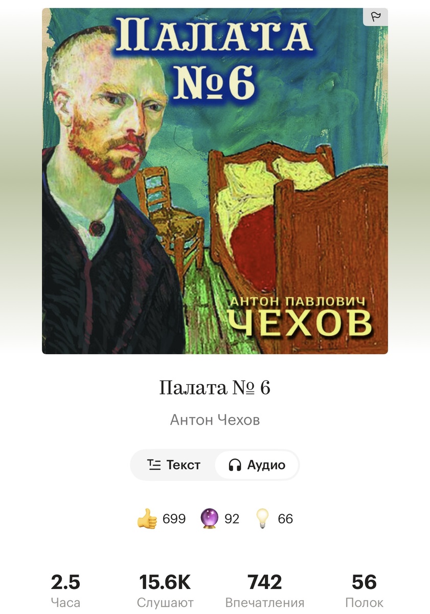 Недавно я наконец послушала «Палату № 6» Антона Павловича Чехова. Сюжет был мне знаком по многочисленным упоминаниям, но хотелось узнать всё из первых уст, без пересказов и интерпретаций.