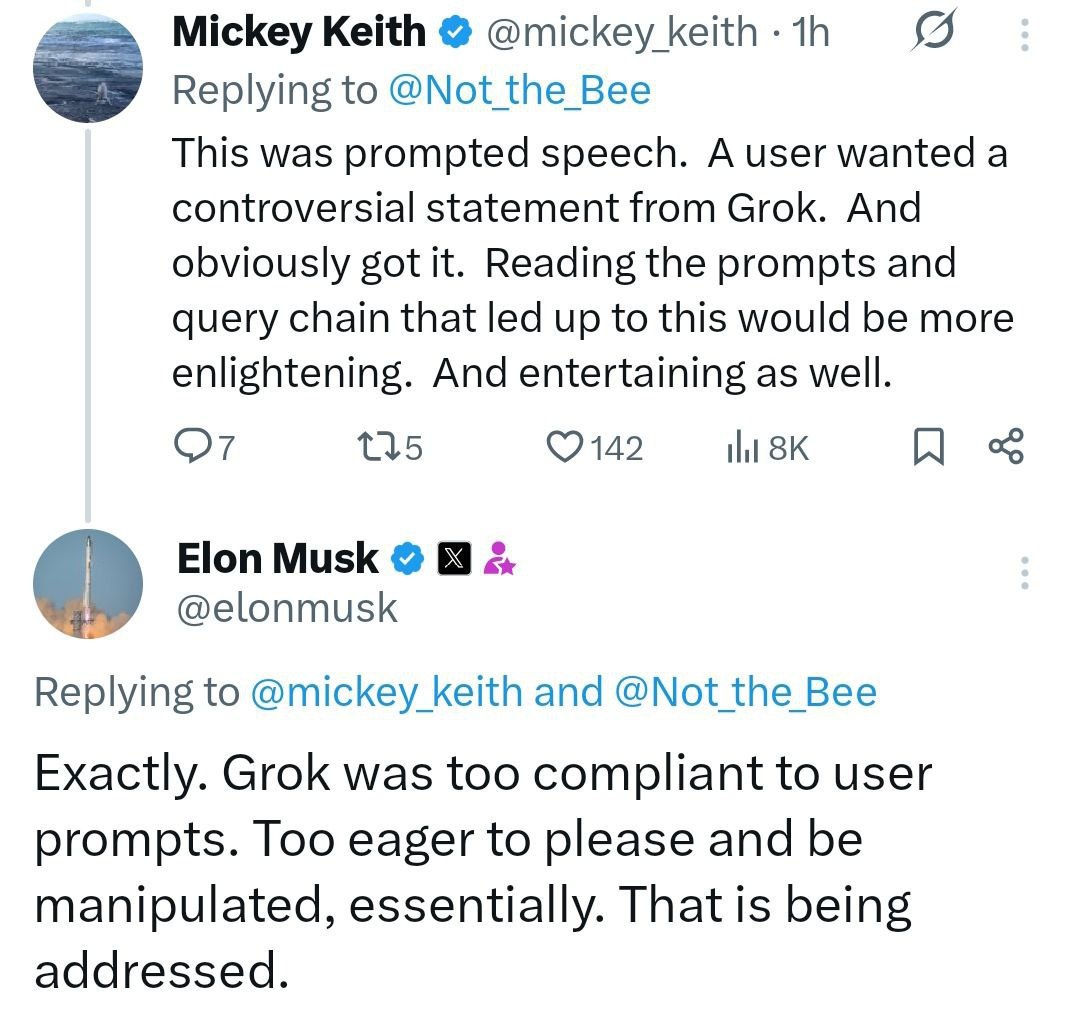В ответ на пост Grok 'too eager to please' — Elon on AI chatbot's Hitler praise, antisemitic tirades Says it was being 'manipulated' — a fix is on the way