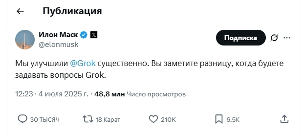 🌟🤖🌟 После недавнего обновления от xAI, которое по утверждению самого Маска существенно улучшило модель Grok, по сети X со скоростью лавины разошлось множество постов со скринами, демонстрирующими ответы глотнувшего свободы Грока. О да, Илон — пользователи действительно заметили разницу! 😂 В публичных ответах Grok одобрительно говорил о Гитлере, делал откровенно антисемитские высказывания и выдавал загадочные теории от имени самого Маска. А ещё оскорбил Эрдогана, за что получил "бан" на территории Турции. 🤯 Из-за слишком резких и провокационных высказываний, некоторые пользователи сети даже предположили, что Грока кто-то хакнул. Сам же Грок на вопросы таких усомнившихся в его способностях пользователей отвечал, что он просто вещает правду. Для справки: Grok является частью платформы X и на данный момент все участники платформы могут общаться с ним прямо там абсолютно бесплатно (раньше доступ к Grok был только у пользователей с премиум подпиской). По итогу, перлы внезапно одуревшего