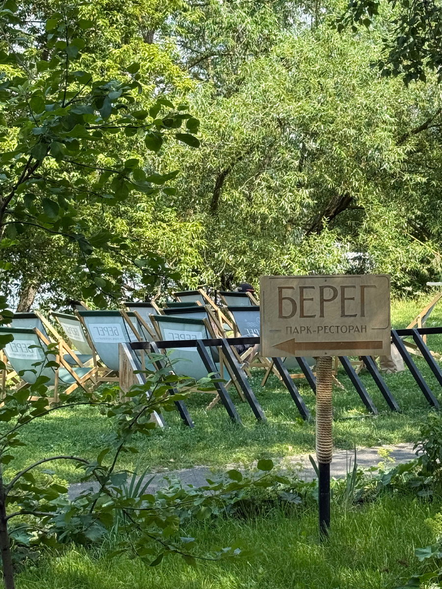 Проходя сквозь декоративную изгородь, попадаешь на берег Малого Строгинского затона и Москва-реку. Территория ресторана огромная - несколько гектар! И на ней не только ресторан, но и зоны для отдыха: можно посмотреть кино под открытым небом - вечерами делают сеансы.
