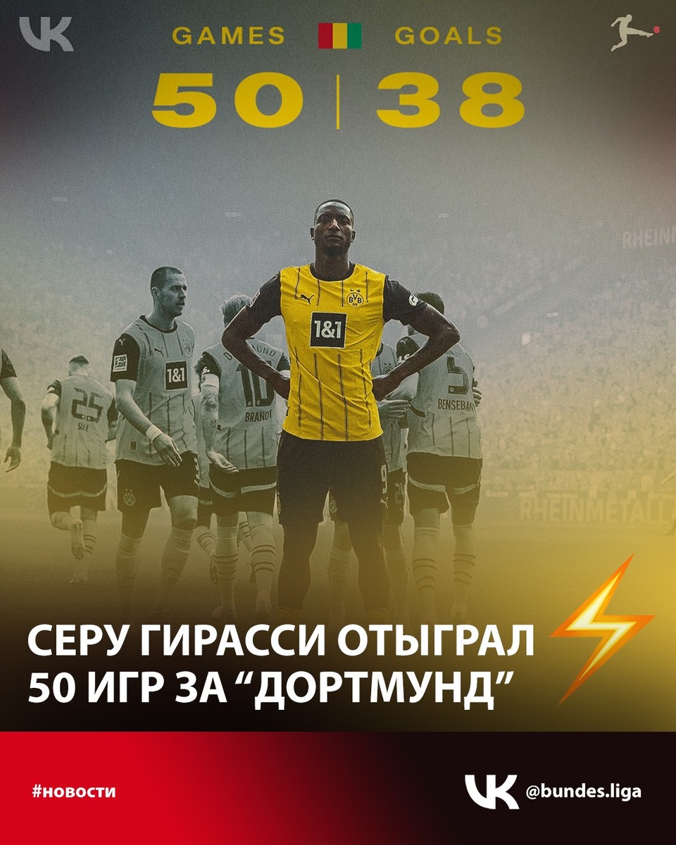 Отличный темп 🔥⚽ Центральный нападающий дортмундской «Боруссии» и национальной сборной Гвинеи отыграл за клуб 50 матчей, забил 38 голов и отдал 9 голевых передач. Интересно будет посмотреть на 29-летнего форварда в новом сезоне Бундеслиги 25/26 ⏳