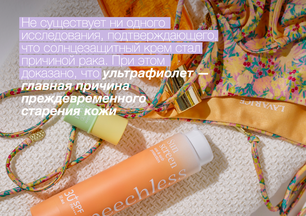 В этом сезоне начался настоящие переполох: блогеры TikTok подхватили тренд и дружно отменяют солнцезащиту. Естественная красота, clean skin — без ухода, без санскрина, без страха старения. Но все ли так однозначно? Разбираемся в статье. Делимся переводом тезисов из видео, которые легли в основу «отказа». — В мае 2019 FDA (прим. ред. FDA — управление по санитарному надзору за качеством пищевых продуктов и медикаментов в США) опубликовали исследование, в котором говорится, что компоненты из солнцезащитных средств, которые использовали хотя бы 1 день, проникают в кровь. Превышая безопасный и допустимый стандартами FDA уровень. — Один ингредиент — оксибензон (oxybenzone) превышает допустимый уровень всего после 2 часов на коже. Эти компоненты способны отрицательно воздействовать на весь сложный метаболический процесс, перегружая печень и почки. И в целом вредны для организма. — Чем больше солнцезащитного средства мы используем, тем выше вероятность рака кожи. Продажи солнцезащит выросли в