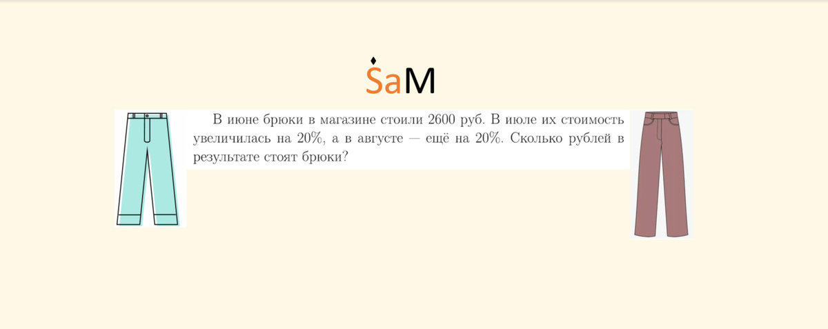 В июне брюки в магазине стоили 2600 руб. В июле их стоимость увеличилась на 20%, а в августе – еще на 20%. Сколько рублей в результате стоят брюки? Для дальнейшего развития канала и публикаций бесплатного контента жмите чаще “в топ”, ставьте палец вверх и кликайте на подписку ❤️ Мои каналы: Vkвидео RUTUBE #проценты #вшэ #sam