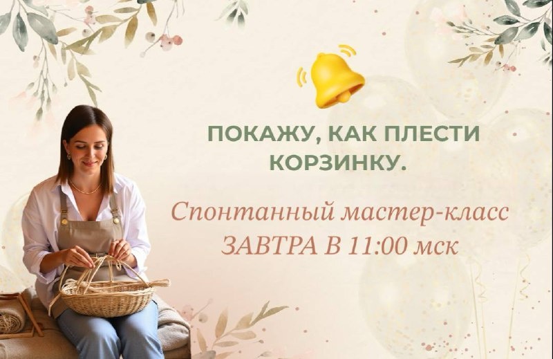 Маленький секрет уюта, которым хочется поделиться… 🧺 Завтра утром решила устроить небольшой мастер-класс – покажу, как я плету свои уютные корзиночки из бумажной лозы. 😊 Может, кому-то пригодится для вдохновения или просто приятного времяпрепровождения? В 11:00 МСК начнем! Формат камерный: показываю, как за два часа из тонких трубочек получается настоящая корзинка. Без туманных объяснений — всё по шагам, крупным планом. Что вы получите на эфире: ✔️Разберём материалы и подготовим основу для плетения ✔️ Покажу логику сборки: где начинается дно, как формируются стенки, почему края держат форму. ✔️ Увидите краткий «проход» по каждому этапу — чтобы картинка сложилась целиком. А после встречи – небольшой бонус (куда же без него 😉) в благодарность за проявленный интерес и внимание. Если захотите – буду рада компании! Вместе плести всегда веселее. ❤️