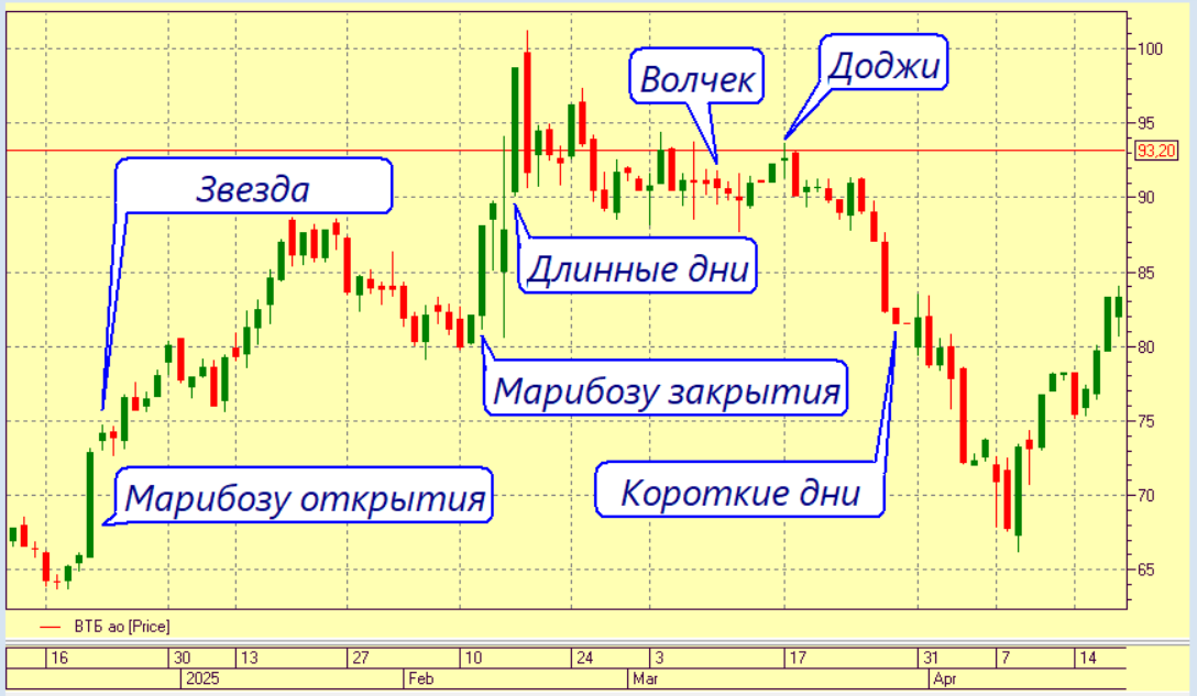 - «Марибозу закрытия» –.это длинные свечи не имеющие теней с той стороны тела которая показывает цену закрытия торгового периода времени.