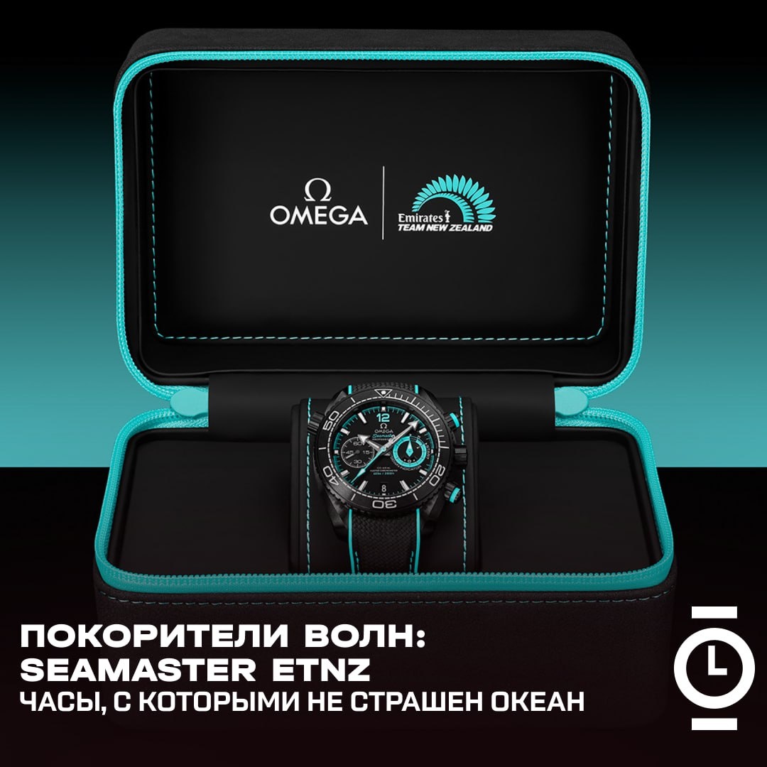 ПОКОРИТЕЛИ ВОЛН: SEAMASTER ETNZ — ЧАСЫ, С КОТОРЫМИ НЕ СТРАШЕН ОКЕАН #обзор_WD С 1995 года Omega поддерживает яхтенную команду Emirates Team New Zealand (ETNZ), и к 37-му Кубку Америки, который прошел в Барселоне в 2024 году, бренд представил новую модель — Omega Seamaster Planet Ocean Deep Black ETNZ Edition (реф. 215.92.46.51.01.003). Часы выполнены из матовой чёрной керамики (оксид циркония) и вдохновлены логотипом ETNZ — цветовая гамма включает чёрный и бирюзовый. Диаметр корпуса — 45,5 мм, толщина — 19 мм, расстояние между ушками — 52,4 мм. Безель — вращающийся, с чёрной керамической вставкой. Сапфировое стекло с антибликовым покрытием защищает циферблат. На 10 часов размещён ручной клапан для выпуска гелия, на 3 — завинчивающаяся заводная головка. Бирюзовые кнопки хронографа не завинчиваются, но водонепроницаемы. Заявленная водозащита — до 600 м. Задняя крышка из керамики — с логотипом ETNZ и фирменным фиксатором NAIAD Lock, благодаря которому гравировка всегда идеально ориент