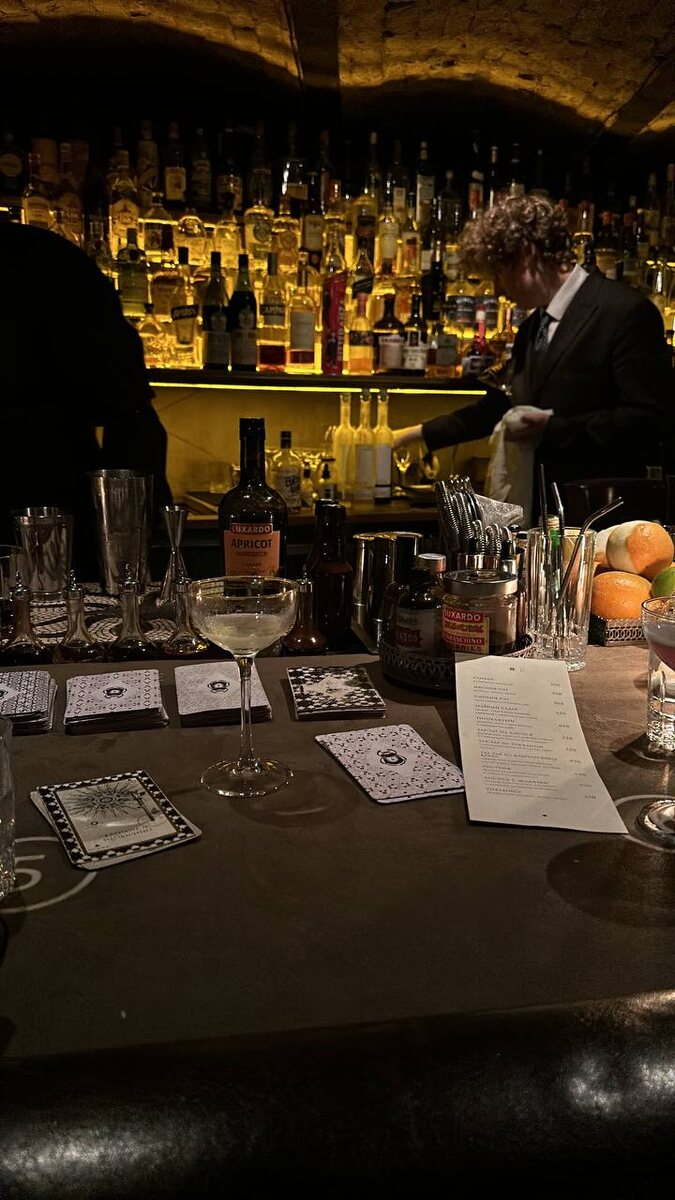Иногда дорога к удовольствию проходит через пятки, натёртые в ноль После свадьбы друга мы с женой решили закрыть вечер прогулкой по Питеру. У неё был запланирован один атмосферный бар, который она давно хотела посетить. А у меня — ноль желания. Устал, злой, всё болит. Пятки натёр в кровь, хотя ботинки хорошие, просто разучился жить вне шлепок. Дождь пошёл. Такси подорожало в 3 раза. Таксист нервный. Карты не работают. Интернет не ловит. Только наличка. А её нет. Просим остановить у банкомата. Он не работает. Таксист требует доплатить. Я доплачиваю 200₽ — он ухмыляется, как будто мало. Я спрашиваю: «Сколько надо?» — он говорит: «А вы сами подумайте». Классика. Уже думаю: всё, ну его, поедем домой. Но жена уговаривает. Приезжаем в какой-то двор, заходим в подъезд, звоним в дверь. Всё как будто в 90-х. Ни вывески, ни таблички. Только по записи. И вдруг — мы внутри. Приглушённый свет, шкафы с книгами, за столами сидят пары, и бармен как крупье делает коктейли по картам. Есть колода, ты