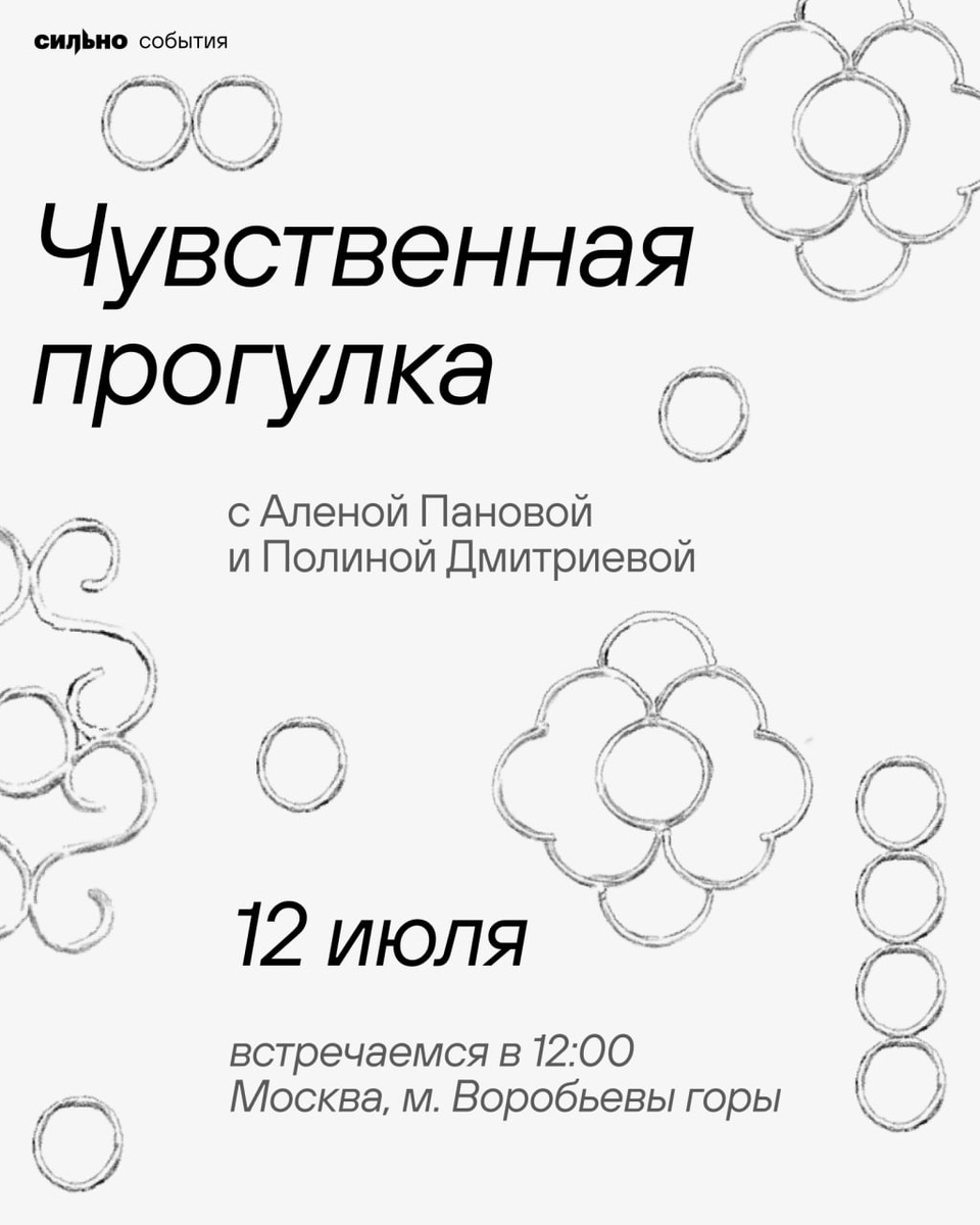 Москва! Приглашаем на Чувственную прогулку по ЮЗАО* / (Friends Edition) Вместе с художницей, куратором и сооснователем «Сильно» Полиной Дмитриевой и нашей резиденткой — художницей, ландшафтным архитектором, автором блога «новый русский китч» про городское благоустройство Аленой Пановой. 12 июля (суббота) Старт в 12:00 Встречаемся в м. Воробьевы горы, г. Москва «Нас ждет особенная прогулка – по моему району детства и местам теплых воспоминаний. После долгого отсутствия возвращение всегда окрашено особым любопытством: как изменился ландшафт, что сохранилось, а что стало новым», — говорит Полина. Наша прогулка пройдет в спокойном темпе. Мы поговорим о культуре и искусстве, ландшафте и о жизни между Москвой и Дагестаном. Нас ждет все, что мы так сильно любим — наблюдение, разговоры, вниманием к деталям. План дня: стартуем у метро Воробьёвы горы, поднимемся к Дворцу пионеров и обязательно заглянем внутрь, потом двигаемся в сторону Большого цирка и завершим у м. Университет. ➡️ Чтобы п