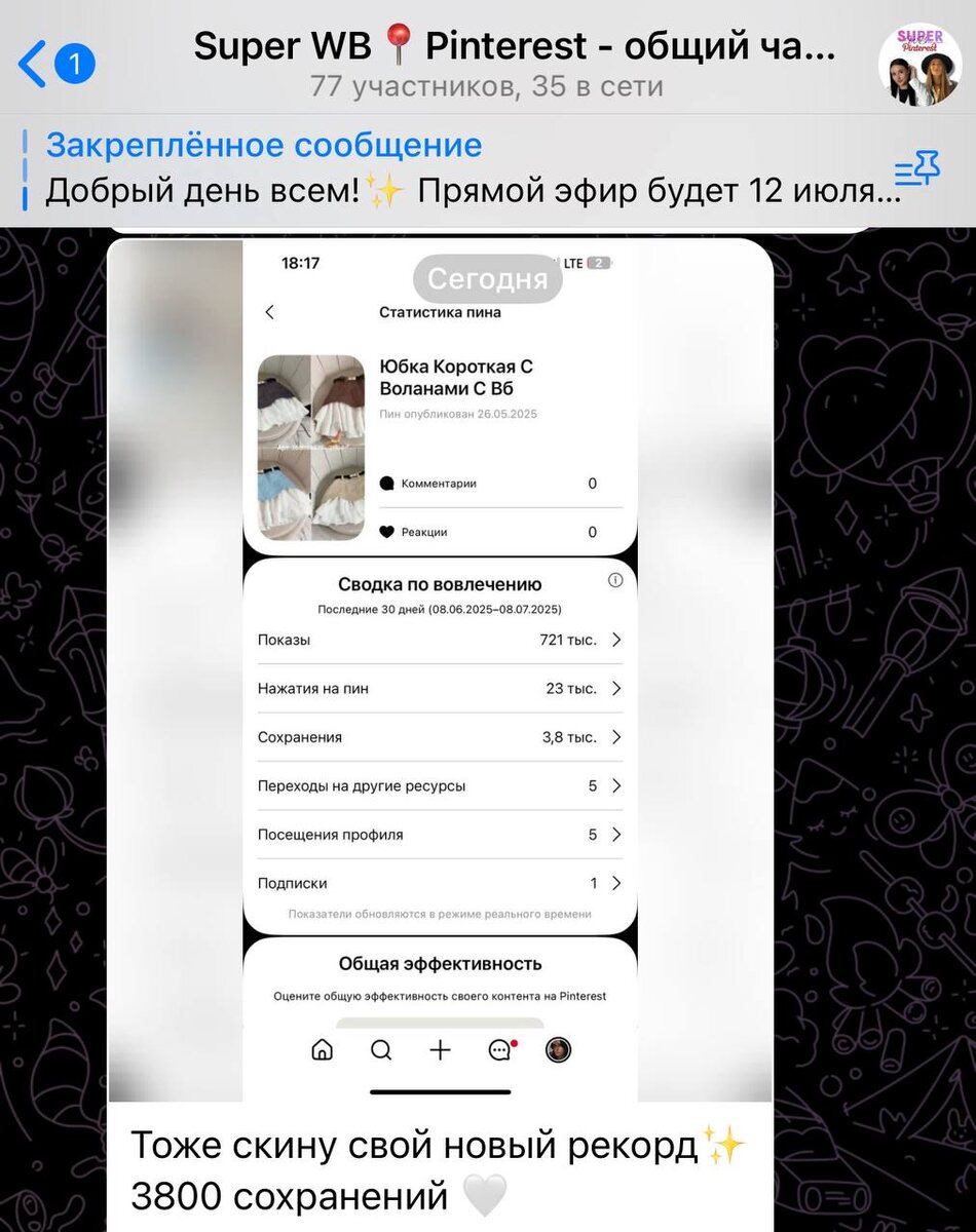 Скрин недели! Это топ! Один пин, 3400 сохранений, а еще сколько скриншотов? Мама не горюй! Их больше! Потому что скринет по статистике в несколько раз больше, чем сохраняет. А еще есть те, кто сразу пошел вводить артикул на ВБ и те кто перешел по ссылке 🔗 (тут не этой статы) Как вам такое? Кто хочет также на свои товары или услуги?