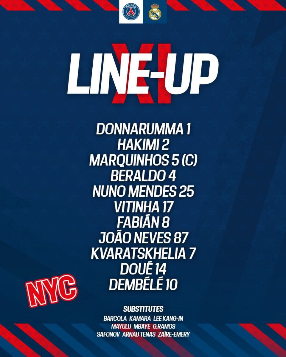МАТЧ ДНЯ: "ПСЖ" - "Реал" - второй полуфинал КЧМ. Главные тренеры Луис Энрике и Хаби Алонсо обьявили стартовые составы. 🇫🇷 Доннарумма, Хакими, Маркиньос, Бералдо, Мендеш, Витинья, Невеш, Руис, Дуэ, Дембеле, Кварацхелия 🇪🇸 Куртуа, Вальверде, Рюдигер, Асенсио, Фран Гарсия, Гюлер, Тчуамени, Беллингем, Винисиус, Мбаппе, Гонсало