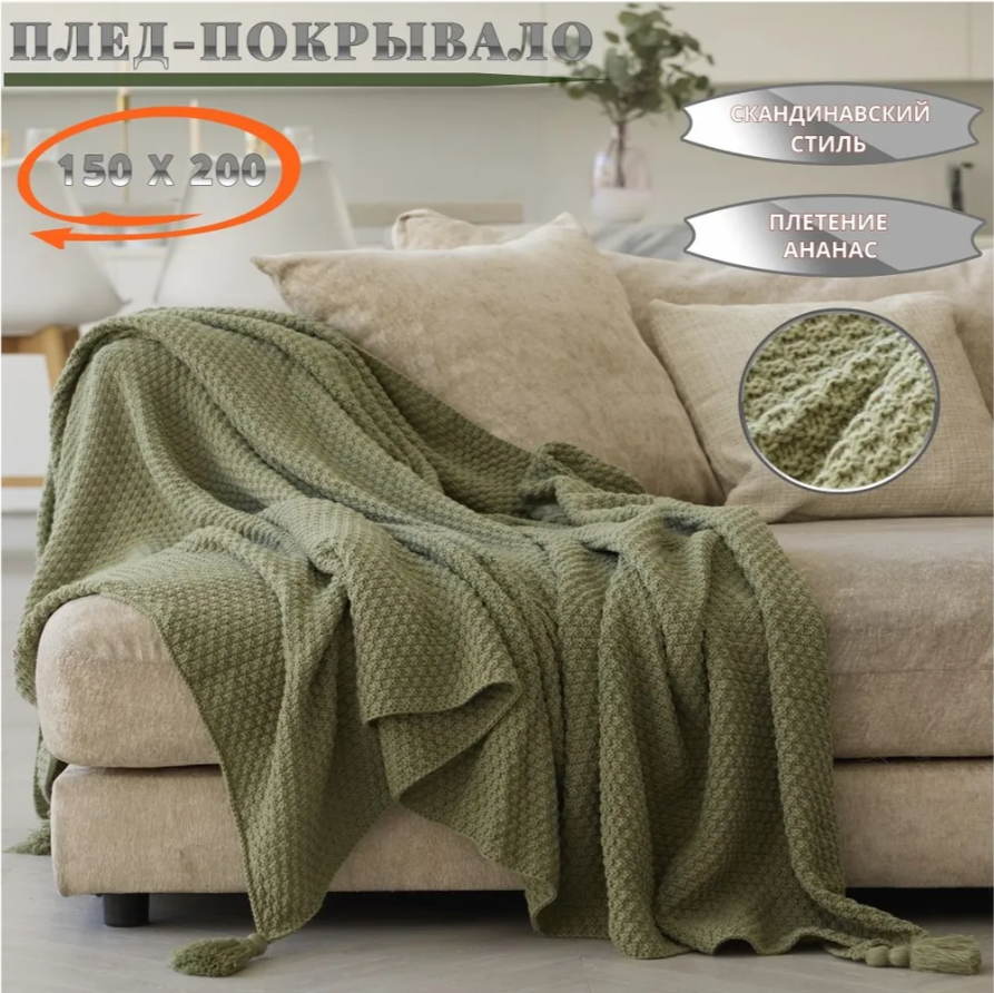 Плед, который не хочется прятать в шкаф. Он мягкий, сдержанный и эстетичный — оливковый цвет с фактурной вязкой моментально делает пространство уютнее. Размер — 150×200 см, можно использовать как покрывало на кровать или диван, как одеяло для отдыха или тёплый акцент в зоне чтения.