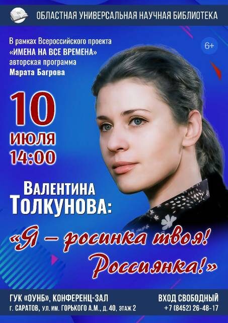 В рамках Всероссийского проекта «Имена на все времена» в библиотеке состоится литературно-музыкальная гостиная «Я – росинка твоя! Россиянка!». Автор и ведущий программы, региональный координатор проекта Марат Багров расскажет о жизненном и творческом пути народной артистки РСФСР, певицы с чарующим голосом и удивительной судьбой Валентины Толкуновой. Это будет живое путешествие в эпоху, наполненную романтикой песни и неподдельными эмоциями. В программе: ✨ История жизни Валентины Толкуновой – от скромного провинциального театра до всесоюзной славы. ✨ Редкие кадры из фильмов, документальных хроник и выступлений певицы. ✨ Музыкальные номера в исполнении лауреатов международных и всероссийских конкурсов. Приходите, чтобы снова услышать ту самую музыку, от которой замирает сердце! 🗓 10 Июля ⏰ 14:00 📍Областная универсальная научная библиотека ул. им. Горького А. М., зд. 40 Вход свободный