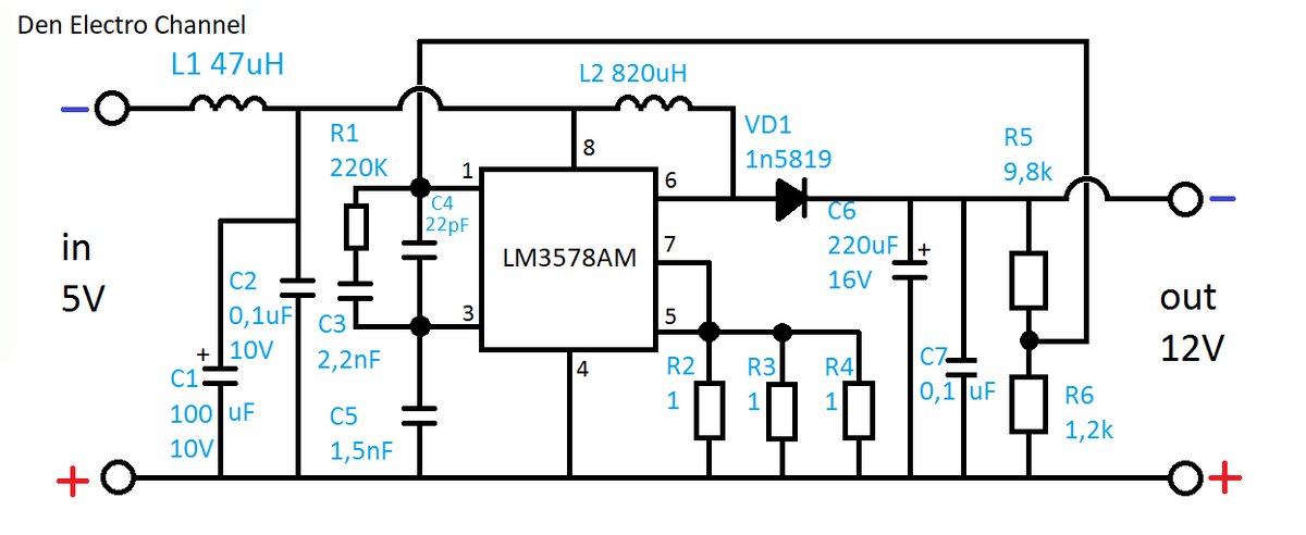 Привет всем! Сегодня мы детально рассмотрим, как можно увеличить напряжение стандартного USB-разъема с 5 Вольт до 12 Вольт с помощью импульсного DC-DC преобразователя на микросхеме LM3578AM. Такая схема идеально подойдет для питания маломощных устройств, например, небольших вентиляторов или светодиодных светильников. Важно помнить, что ток нагрузки не должен превышать 150 мА. Принцип работы схемы Поскольку наш преобразователь является импульсным, на входе установлена индуктивность L1. Её задача — предотвращать проникновение импульсных помех в цепи устройства, питающегося от USB-порта. В основе микросхемы U1 (LM3578AM) лежит импульсный генератор с широтно-импульсной модуляцией (ШИМ) и встроенный выходной ключ на биполярном транзисторе. Этот ключ подключен к выводам 6 (коллектор) и 5 (эмиттер) микросхемы. Вывод 7 служит входом для контрольной схемы защиты по току. Она отслеживает ток, проходящий через ключ, по падению напряжения на низкоомных резисторах R2-R4. Если ток превышает допустим