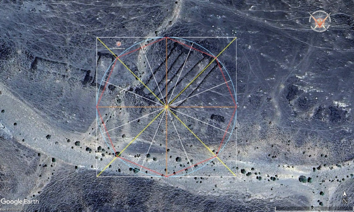 Ещё одно подтверждение универсальности основных принципов построения СДМС, которые верны для самых различных объектов. На изображениях ниже показан один из видов аравийских геоглифов, так называемые «ворота». Данная группа имеет координаты 25°38'45.12"С 39° 4'15.16"В. Средняя линия самого восточного прямоугольника сориентирована точно на северо-восток, т.е. соответствует углу октагона 45°. Два центральных прямоугольника сориентированы согласно углам пентаграммы 18° и 36°. Таким образом, данный комплекс позволяет определить, как минимум, расположение сторон света двумя способами.
