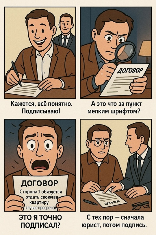 Когда читаешь договор мелким шрифтом… Сначала кажется — обычный документ. А потом замечаешь то, что могло бы стоить тебе нервов, денег… или даже квартиры. Читайте внимательно. Или покажите юристу — это дешевле.