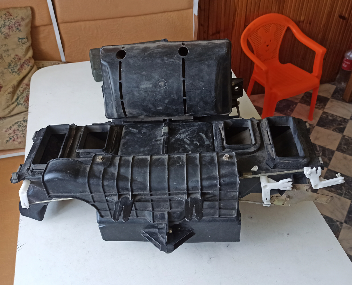 Речь пойдет вот о такой печке. Чтобы ее разобрать ее нужно будет снять с машины, потому как иначе ничего не получится. Снятие печки с машины это отдельная тема. Первым делом снимаем вот эту деталь, которая закрывает тяги приводов заслонок потоков воздуха. Она крепится на трех болтиках, смотрите фото. После, у вас появляется вот такая картина. И тут нужно снять. Вот эти тяги. Можно снять с любой из сторон, главное запомните как они стоят, ну или пользуйтесь фото, на фото они стоят правильно. Снимаются просто, нужно просто потянуть или разжать зажимы и вынуть крепление. Вот в этих местах. С любой стороны, с какой захотите. После того, как вы отсоедините эти тяги, можно приступать к основной разборке. Нужно снять защелки, которые скрепляют две половинки. Их всего 8 штук. Расположены по этому шву со всех сторон. Но также есть нюанс. После того, как вы сняли все 8 защелок, нужно открутить вот эти болты. Они спрятаны и их можно не найти, особенно нижний возле радиатора, он очень хорошо сп