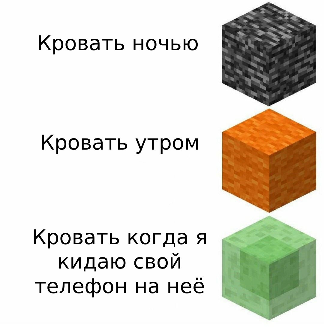Благодаря мемам в Майнкрафте можно поднять себе настроение. Сегодня подготовлена для вас новая подборка. Приятного просмотра! С предыдущей подборкой можно ознакомиться здесь. То чувство, когда пытаешься заснуть ночью, а по каким-то причинам, сделать это не получается. Кажется, будто ты спишь на бедроке, а когда уже проснулся, уже словно лежишь на шерсти. А вот когда кидаешь свой телефон в нее и он отскакивает. О слизневый блок! То чувство, когда играешь в Майнкрафт и еще не спускался в пещеру. А когда спустился столкнулся с этим странными звуками... То чувство, когда собралась кучка людей, которые понимают этот мем, а также те, которые нет. Признавайтесь, вы понимаете этот мем?) Действительно, есть два типа людей. Сам замечал, как многие держат в инвентаре вещи по-разному. Пожалуй, деление логичное. Ну тут без комментариев. Если ты знаешь что это, то ты знаешь). Если понравилось, поставь лайк, оставь комментарий под постом, и подпишись! Я буду очень рад твоему присутствию! А др