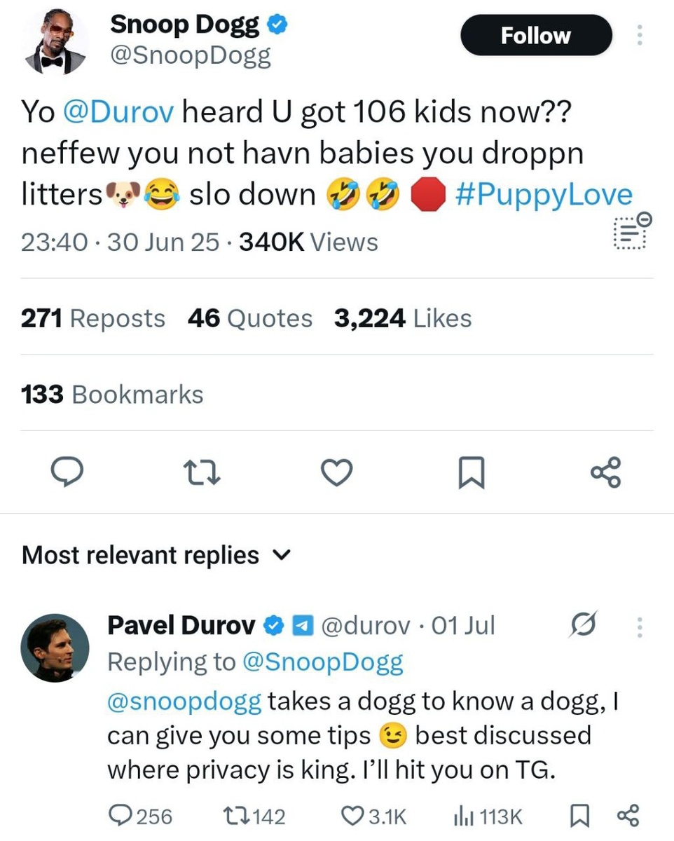 Snoop Dogg out with a whole music vid dedicated to Telegram Hyping up platform and his own new 'Snoopy gifts' All after light-hearted June chat with Telegram's CEO Durov В этом посте есть большое видео, которое не загрузилось в Дзен. Откройте оригинал поста в телеграме, чтобы его посмотреть