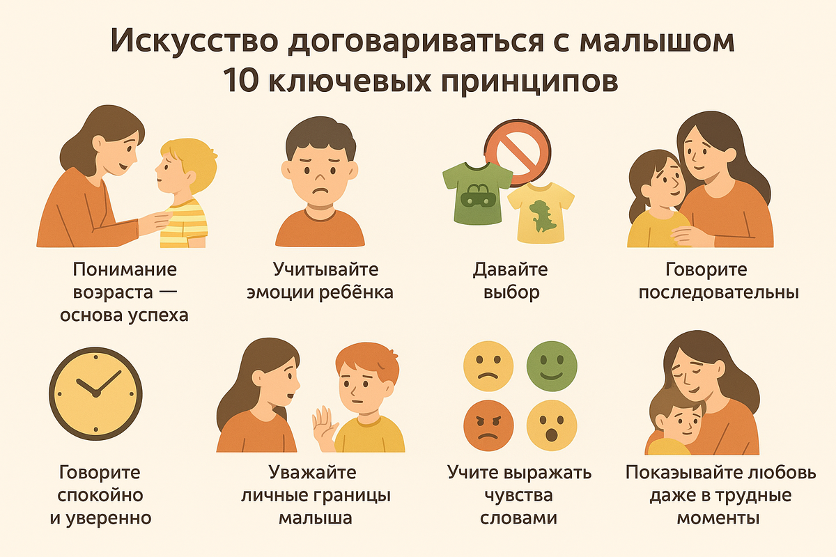 Дети дошкольного возраста — это настоящие исследователи мира. Они всё хотят попробовать, часто не понимают границ и запретов, и при этом очень чутко реагируют на эмоциональный тон взрослых. Умение договариваться с малышом — это навык, который строится на уважении, любви и терпении. 💡 1. Понимание возраста — основа успеха - Малыши не могут мыслить как взрослые: их мышление конкретное, они живут «здесь и сейчас». - Не стоит ожидать от ребёнка логики или способности учитывать чужие интересы — всё это приходит позже. 🗣 Пример: «Ты хочешь конфету перед ужином? Я понимаю, тебе очень хочется. Давай выберем, какая будет после еды!» 🧠 2. Учитывайте эмоции ребёнка - За капризом часто скрыта усталость, голод, скука или потребность во внимании. - Вместо того чтобы бороться с поведением — распознайте причину. 📌 Совет: «Ты устал? Давай обнимемся, а потом решим, что будем делать дальше.» 🔄 3. Объясняйте, а не просто запрещайте - Малышу важно понимать причину, иначе запрет — это просто