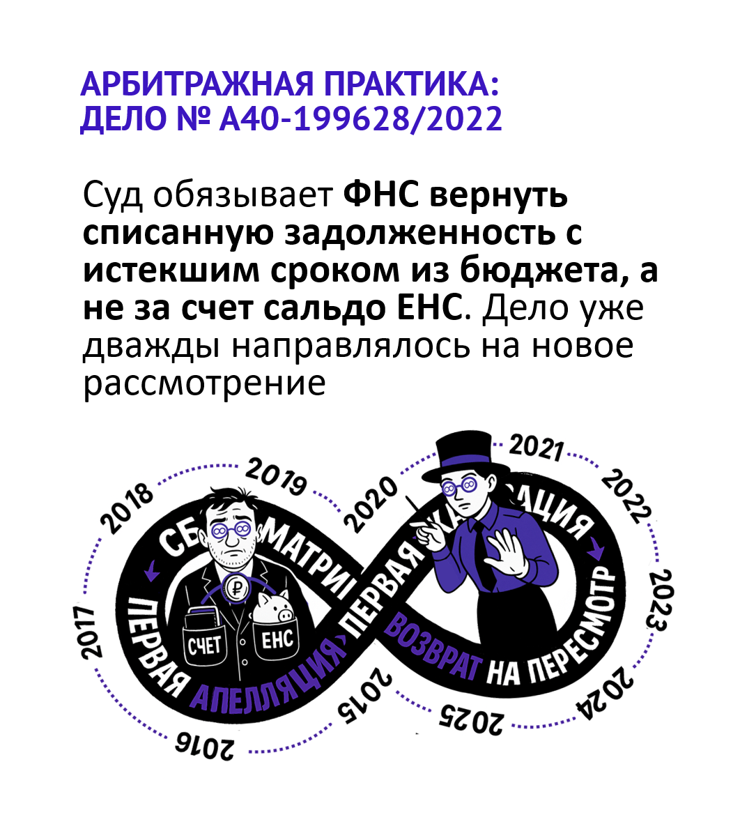 - Признания порочности своей практики. ФНС фактически скажет: "Мы вернули вам деньги, но из вашего же кармана (с вашего положительного сальдо ЕНС)". Если суд скажет, что так делать нельзя, это будет означать, что методология работы в переходный период была неправомерной.