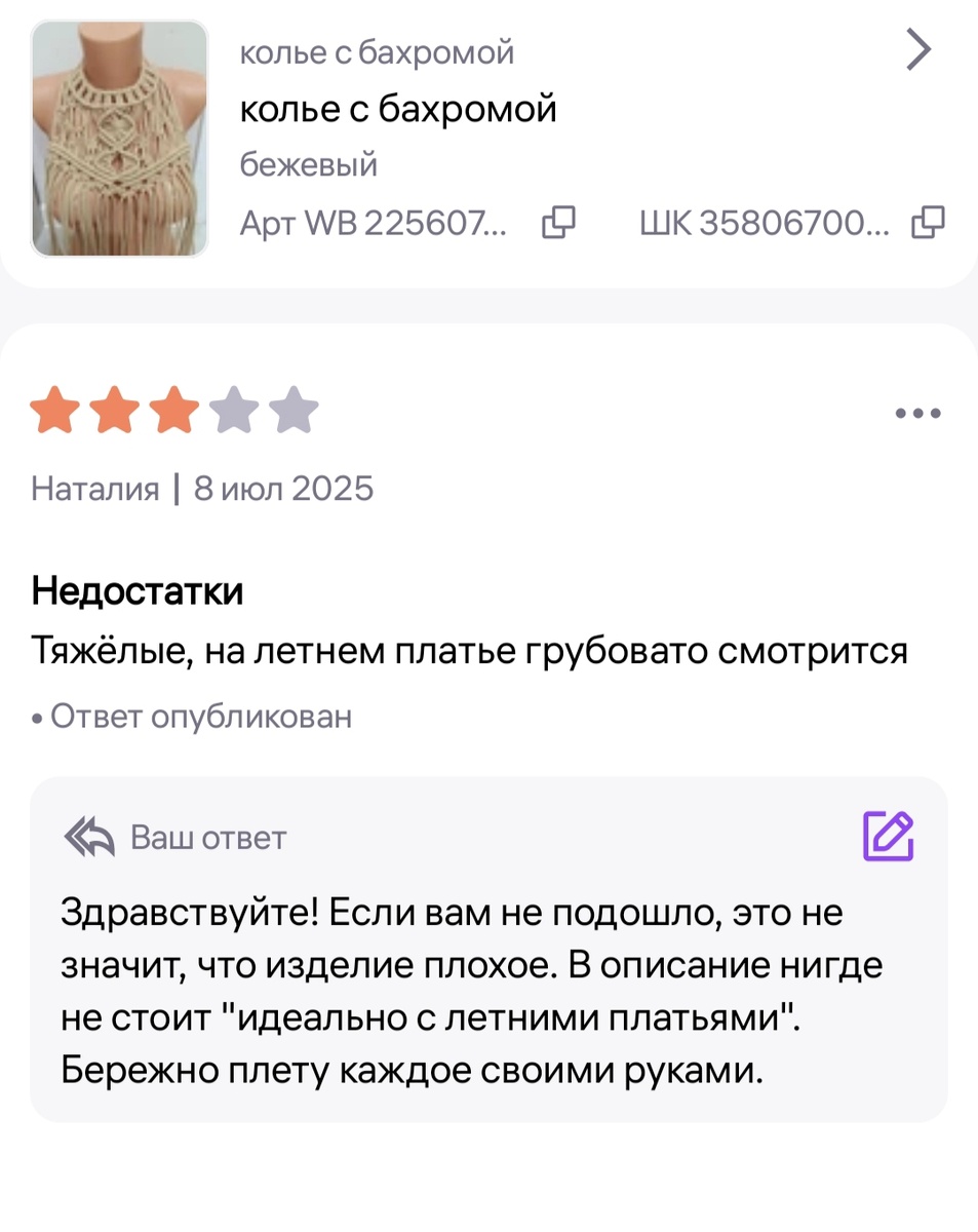 Давайте поговорим на чистоту! Нужно обсудить один момент. Я развиваю свой магазин макраме аксессуаров на маркетплейсе. Сама лично плету все изделия и благодарна каждой девушке, которая сделала заказ. Работаю уже 3 год и вот вчера мне поставили первые три звёзды, что сильно испортило настроение, честно. Я много раз перечитала отзыв. Весь день думала, что написать. Девушка, естественно, не выкупила товар, но зачем было ставить 3 звёзды и подрывать общий рейтинг магазина? Вот не подошёл тебе товар, не твое, ищи что подойдёт, зачем показывать свое «фи». «Грубовато смотрится» - это не оценка качества товара. Я могу принять: 5 звезд и комментарий «может смотреться грубовато». Тебе сплели, упаковали, бесплатно привезли (с продавцов снимается логистика). Мне видимо никогда этого не понять. Стала смотреть все отзывы. Ну вот есть нормальные же Пишу вечером подруге (обожаю своих девчонок) и начинаю рассказывать за этот отзыв. Она поддерживает, говорит «ну как так можно», вспоминает, что видела