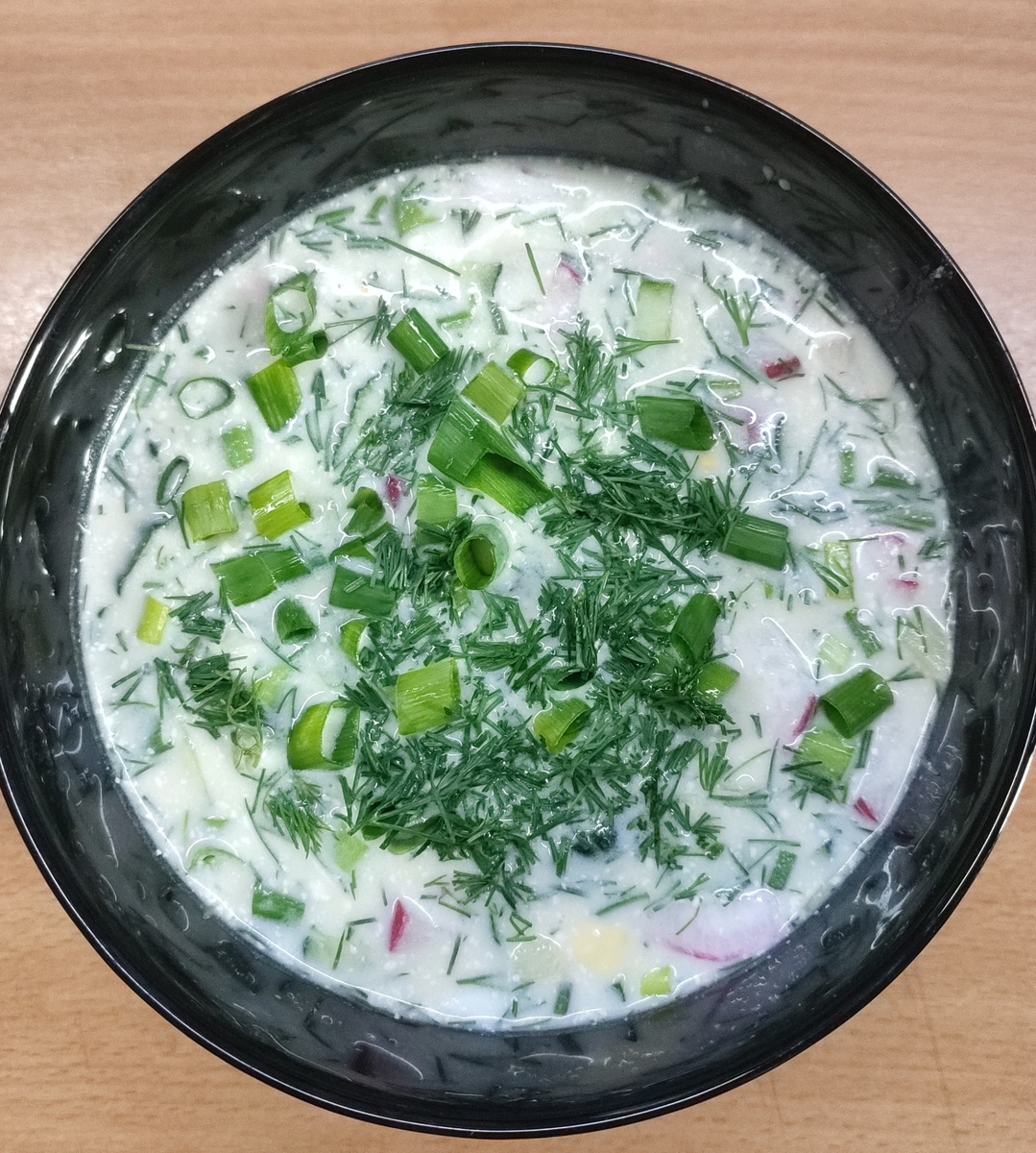 В жаркие дни хочется холодненьких вкусненьких супчиков ,один из них -это окрошка . ОКРОШКА– это холодный суп русской кухни, название которого происходит от слова "крошить", что означает мелко нарезать. Мне нравиться окрошка заправленная кисломолочными напитками( кефир ,тан ) А в последнее время я стала добавлять квас ,всего беру 1:1. Вкус интересный ,попробуйте. ИНГРЕДИЕНТЫ :на 1 порцию Огурец 1 шт ( средний) Колбаса вареная ( можно ветчину или постное вареное мясо ) 100 г Яйца 1 шт Редис 2 шт Картошка 1 шт ( средний) Укроп Зелёный лук Тан Кефир Квас ( можно без него ) Горчица по вкусу Соль по вкусу ПРИГОТОВЛЕНИЕ: Картофель в мундире сварить заранее ,остудить ,почистить и нарезать мелким кубиком. Вареные яйца почистить и нарезать кубиком Огурцы помыть ,нарезать кубиком Редис помыть ,нарезать Колбасу нарезать Все сложить в кастрюлю ,добавить кефир ,тан и квас ,все перемешать ,добавить укроп и лук мелко рубленный по вкусу и по вкусу горчицу и соль . Все перемешать и
