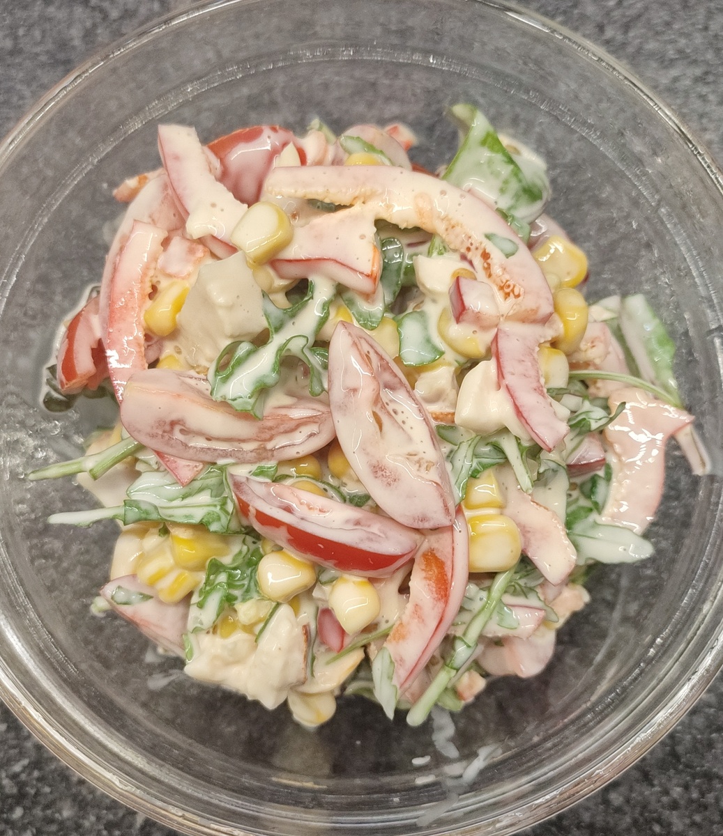 Руколу ,если она крупная ,можно порвать руками ,сложить в ёмкость для смешивания. Туда добавить кукурузу .