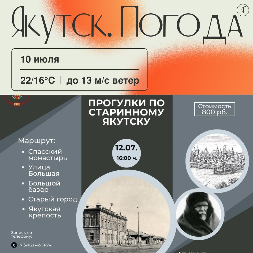 С добрым утром! Музей Ярославского запускает летние пешеходные экскурсии по городу За 2 часа с помощью уникальных фотографий из фондов музея и рассказа экскурсовода вы совершите прогулку-путешествие по-старинному, ныне не существующему Якутску. Экскурсию проводит историк, экскурсовод с 15-летним опытом Сергей Слепцов Маршрут: 🤩 Музей им. Ем.Ярославского 🤩 Спасский монастырь 🤩 улица Большая 🤩 Большой базар 🤩 «Старый город» 🤩 Якутская крепость 🤩 Площадь дружбы Вы познакомитесь с историей города от начала основания до 20 века, узнаете много о первых землепроходцах, купцах, интересных жителях и посетите «Надвратную башню Якутского острога». 🤩 Экскурсия стартует 12 июля в 16:00 с крыльца Главного корпуса Якутского музея им. Ярославского. (пр.Ленина 5/2) 800 руб., билеты в кассе +7 4112 42 51 74 Online Якутия | Подписаться