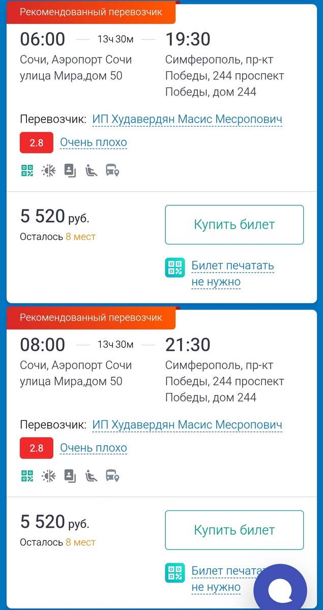Почему билеты нужно покупать ТОЛЬКО через сайт автостанции — и чем опасны «экономные» предложения агрегаторов. В России междугородние автобусы не имеют права забирать пассажиров с улиц, парковок или «серых» остановок. - ✅ Легально: Отправление с официальной автостанции аэропорта Сочи (павильон «Посадочная платформа»); - ❌ Нелегально: Посадка у «Олимпийских колец», придорожных кафе или через «кукушек». 1. Застрять в пути: - Старые автобусы ломаются на трассе «Таврида» (пассажиры по 6+ часов ждут эвакуатор в поле); 2. Попасть в аварию: - Отсутствие техосмотра → отказ тормозов на горных серпантинах; - Водители без медкнижек → засыпают за рулём; 3. Нарваться на хамство: - «Доплатите за кондиционер!» — вымогательство денег в пути; - «Выходите здесь!» — высадка на трассе за 20 км до Симферополя; 4. Остаться без страховки: - При ДТП или травме компенсацию не выплатят (лицензии нет!). ✅ Как проверить легальность за 60 секунд? Ваш чек-лист: 1. Билет купл