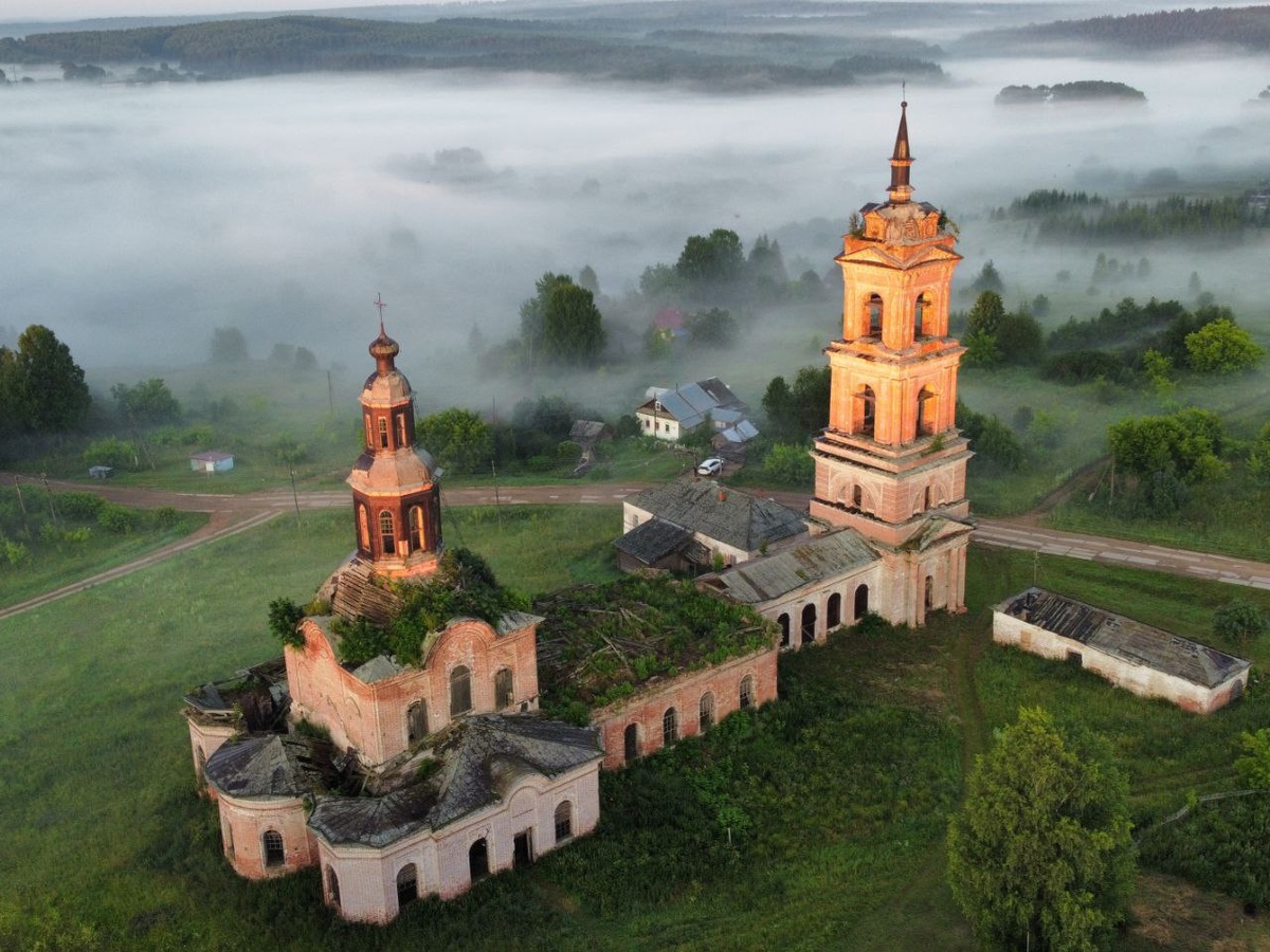 Храм Богородицы в селе Белая словно парит над землей, окутанный утренним туманом. Этот величественный памятник архитектуры в стиле Вятского барокко поражает своей красотой и величием. К сожалению, время не щадит его...
